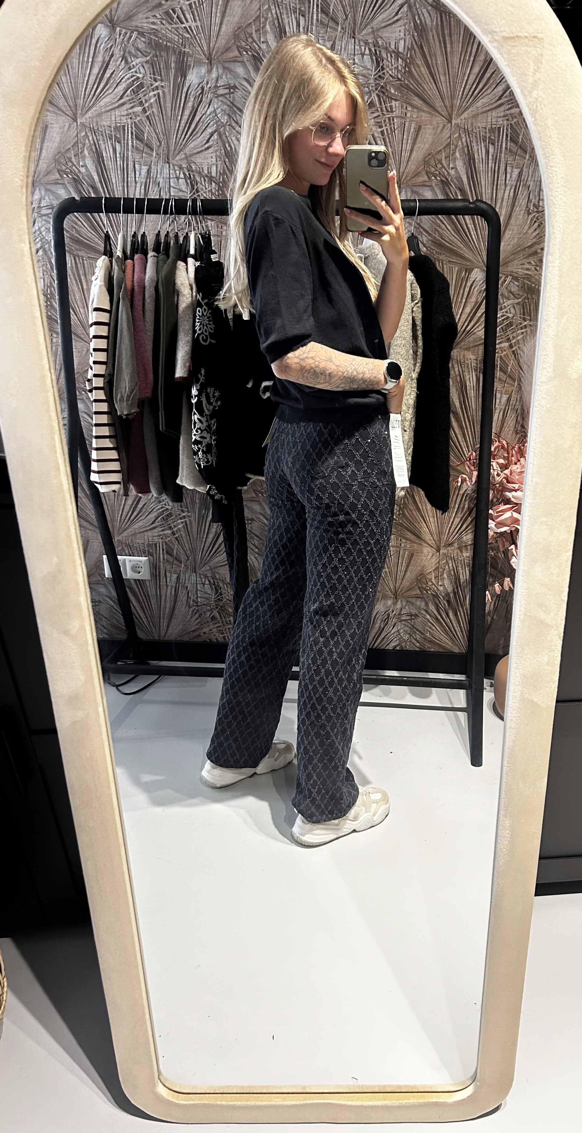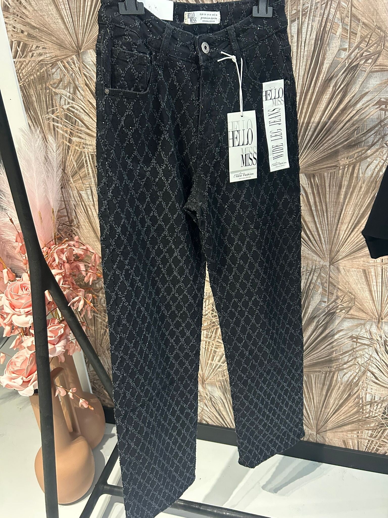 Onze zwarte, glitter stretch jeans wijdleg is comfy, stylish en helemaal on-trend 💛