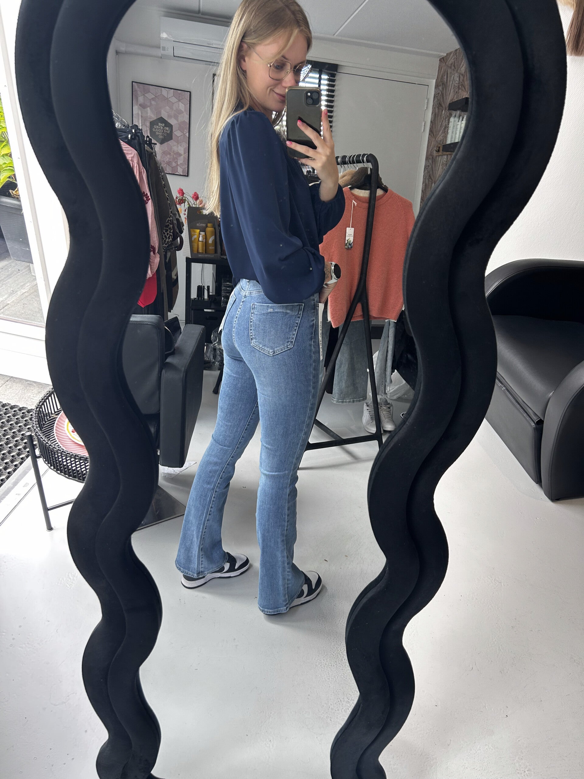 Retro vibes met een moderne fit. Deze blauwe flared jeans accentueert je taille en loopt wijd uit vanaf de knie voor een flatterend silhouet. Gemaakt van stretchdenim voor comfort én stijl. Perfect met sneakers of hakken – jouw nieuwe favoriete jeans.